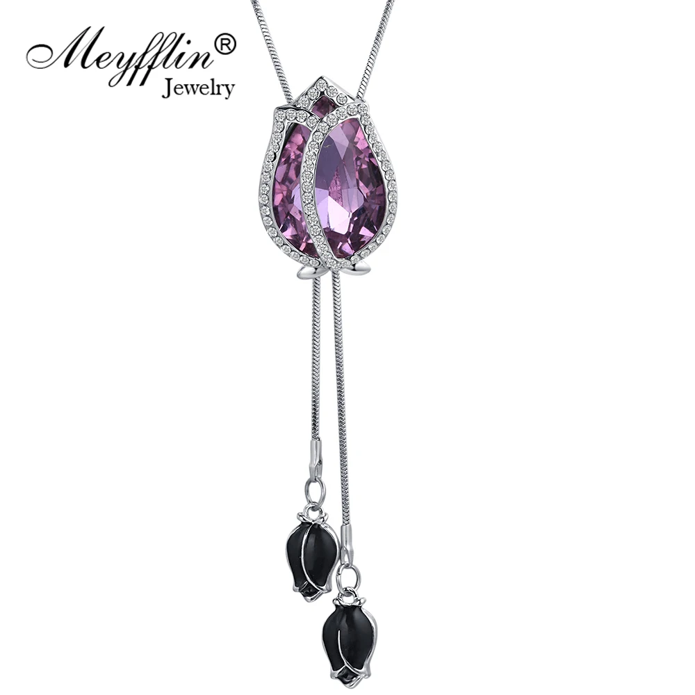 New Meyfflin Tulip Flower Crystal Necklace for Women Fashion Silver Color Chain Long Necklaces & Pendan